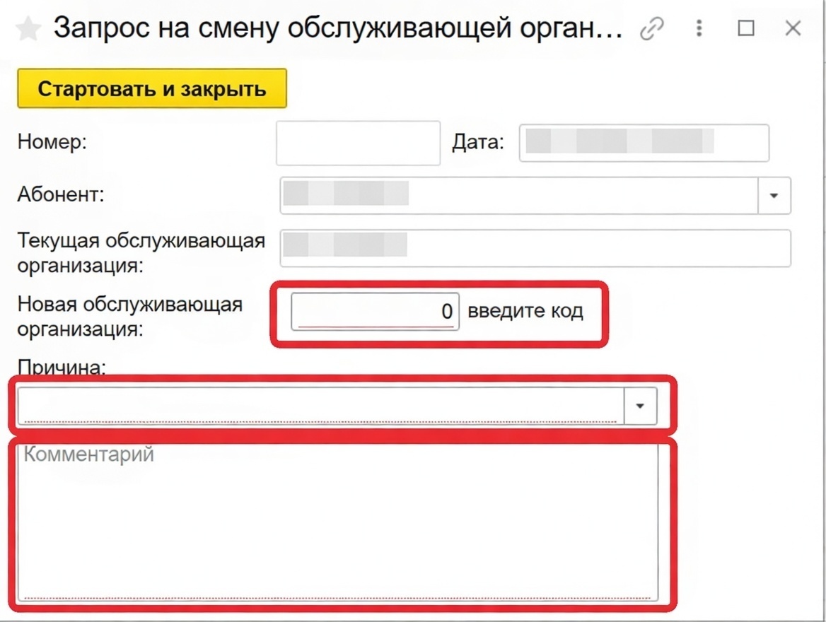 В открывшемся окне заявки введите код абонента новой организации, к которой вы хотите перейти. Также необходимо указать причину смены и, при желании, оставить комментарий. Эти поля обязательны для заполнения.
